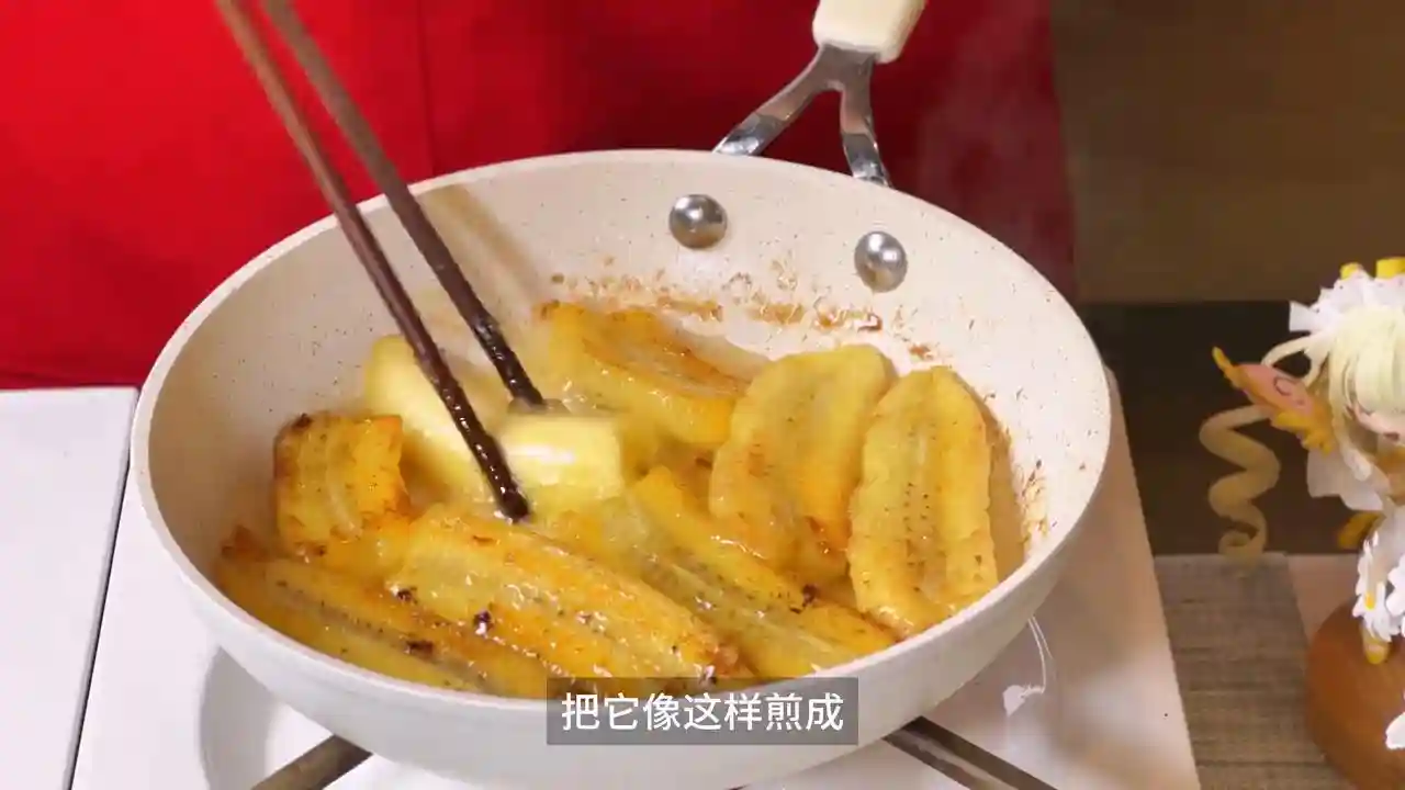 ·再来煎黄油香蕉。黄油放在锅上融化,放入沾满糖的香蕉切块,把它像这样煎成两面都是焦黄色就好了。