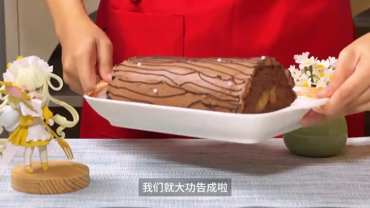 ·开始组装。先在蛋糕体上涂上厚奶油,摆上两排黄油香蕉,借用烘焙纸把它卷起来放入冰箱冷藏一个小时。再把多余的巧克力奶油抹在蛋糕体外面,用融化的巧克力挤上线条,模拟树桩的形状,撒上糖珠装饰就大功告成啦。