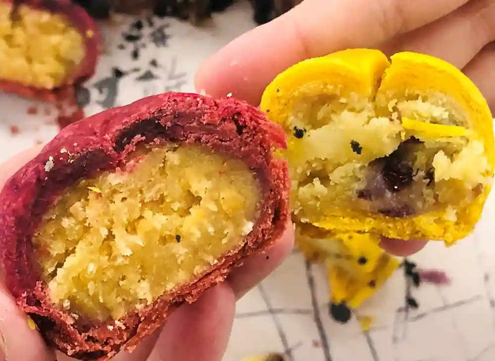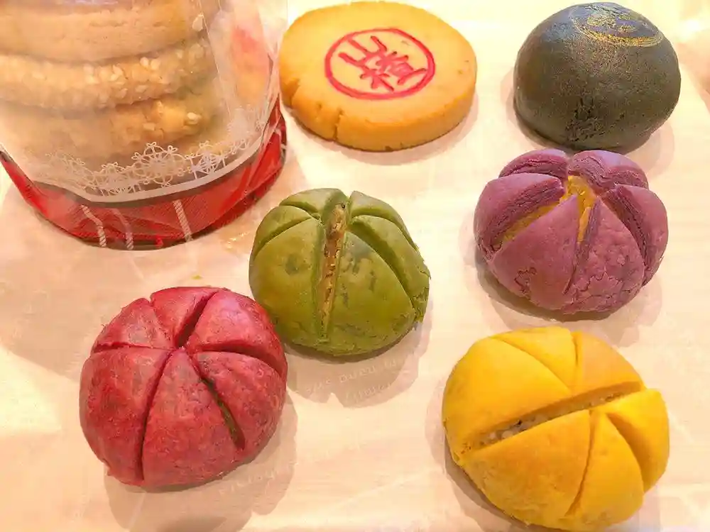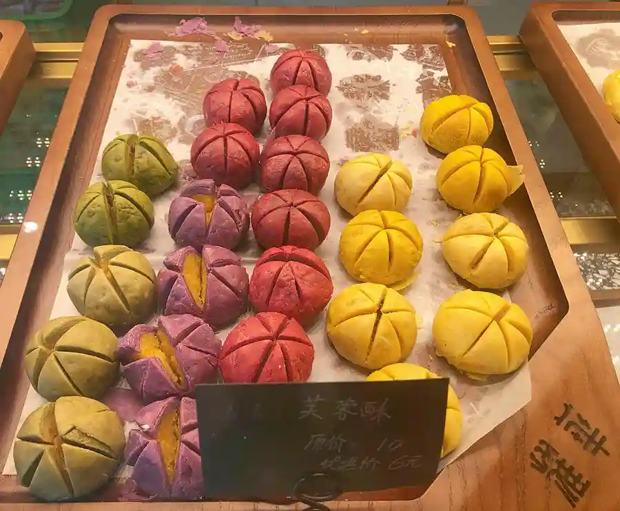 芙蓉酥。这一系列显然是店内的颜值担当~光是看着就可可爱爱!红色皮是红龙果、绿色皮是菜汁来的人,基本上也都是每一种买了一颗。