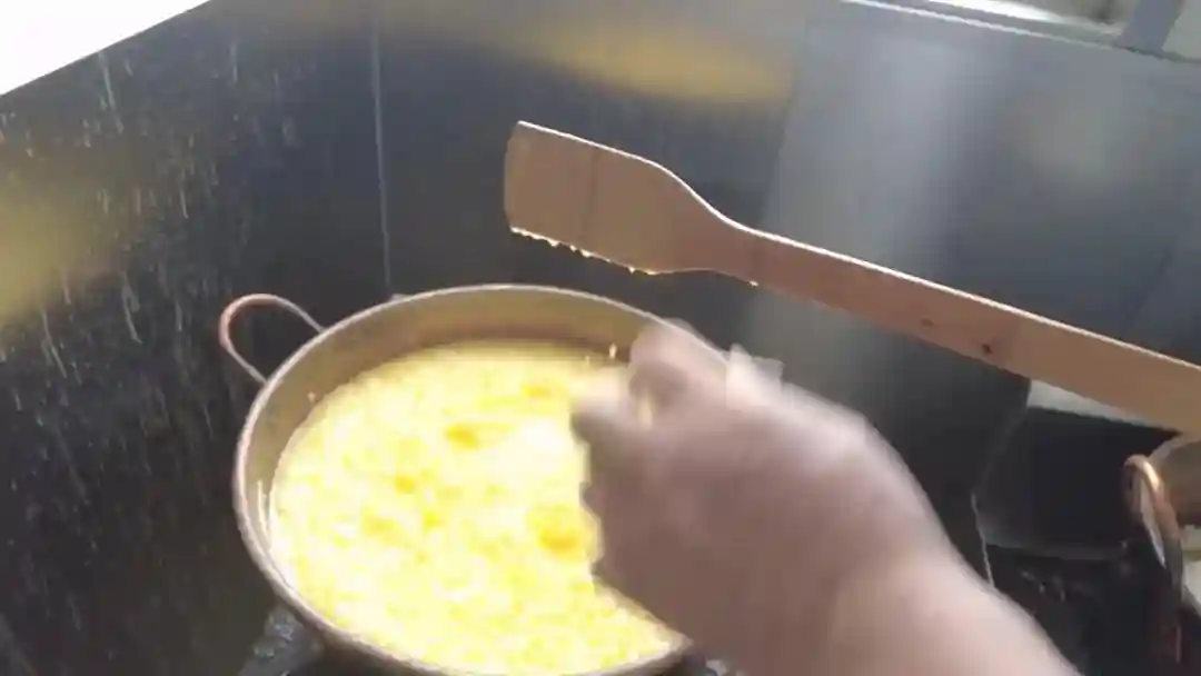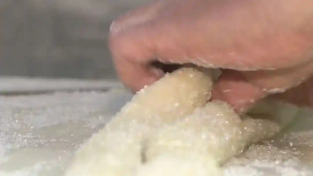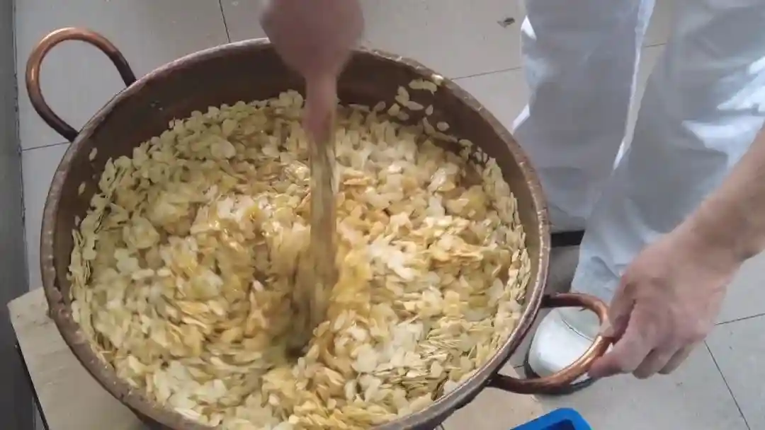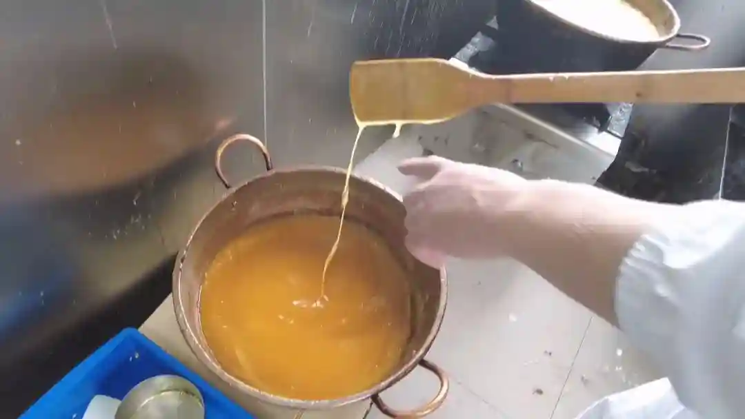 杏仁排和蝴蝶酥都是哈尔滨食品厂的拳头产品。徐伟创告诉记者,“杏仁排的制作主要是一个混酥面团加熬糖制作的,工艺的关键是在熬糖上面。我们的糖是根据季节不同不断调整糖度和温度,包括我们的加工火候的控制,这样制作出的杏仁排比较受市民欢迎,口感的软硬度,包括糖度,经过我们多次的试验和市民调查后得到大多数人的认可。这个产品30多年在上海受欢迎,也是一个不容易的产品。”徐师傅向记者演示,“留下来的糖水不断掉,有根丝在就正好了,现在还没有熬好,有水分在。”“靠这个手工,一个丝长,这个拉出来丝长,一个拉下来就断掉了。”