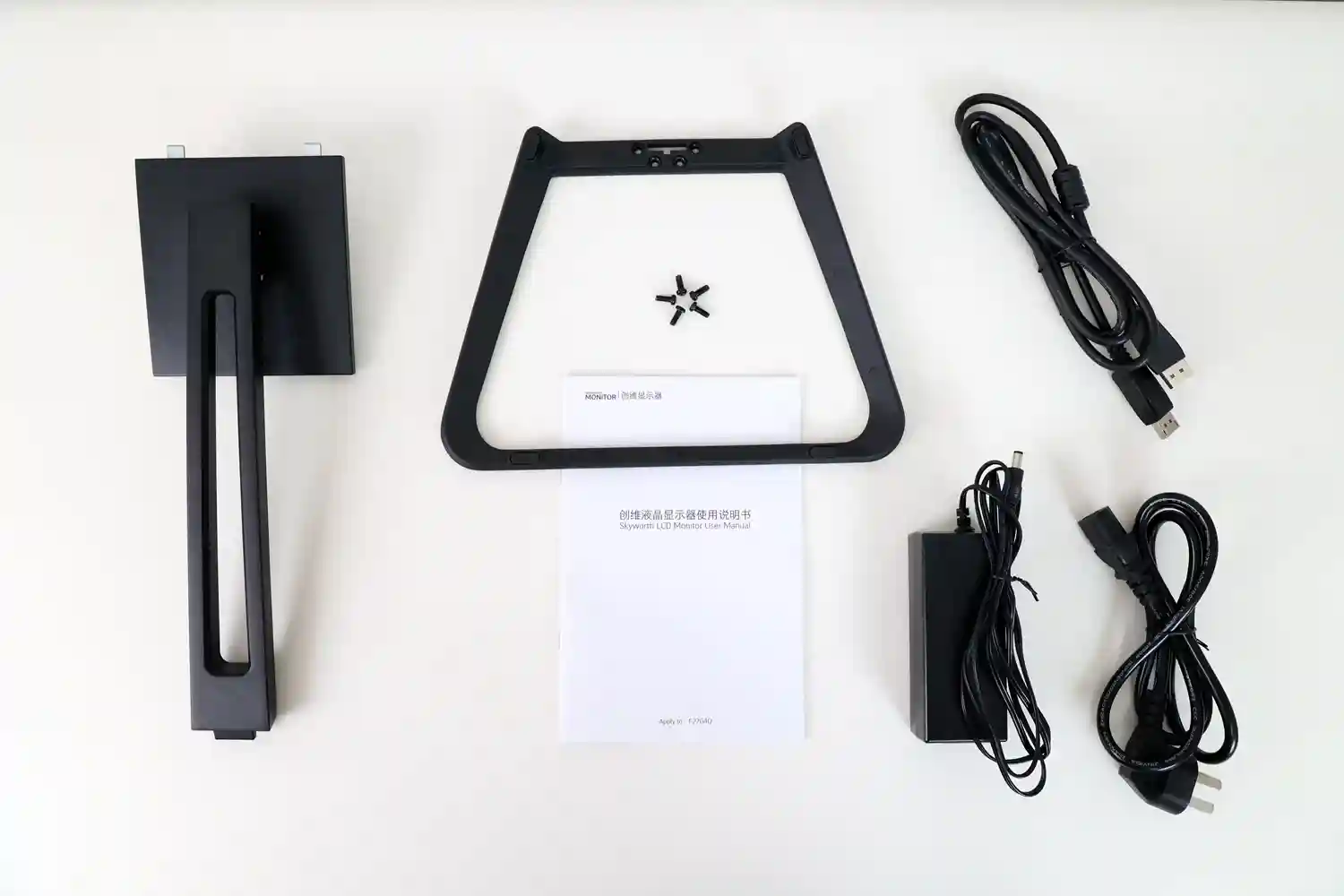 ▲配件也很简单,除了底座和支架外,还有一根线、电源适配器+电源线和一本说明书,仅此而已。