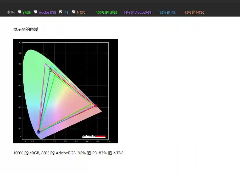 丐武士具备100%sRGB+88%AdobeRGB+92%P3色域覆盖,这个成绩跟黑武士几乎完全一样。