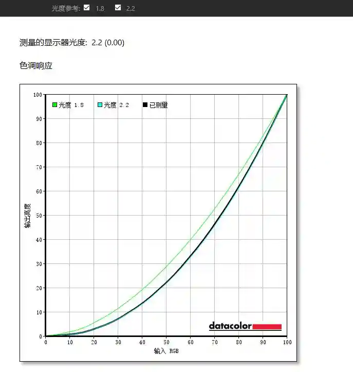 实测伽马值是2.2,响应曲线跟标准曲线也是从头到尾完全贴合,调校的十分精准。