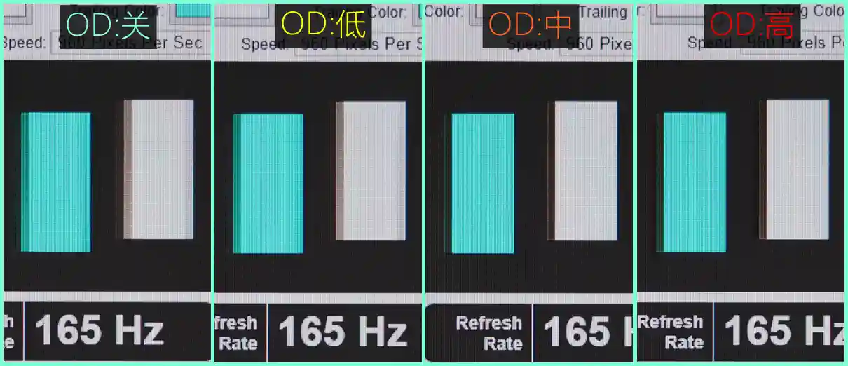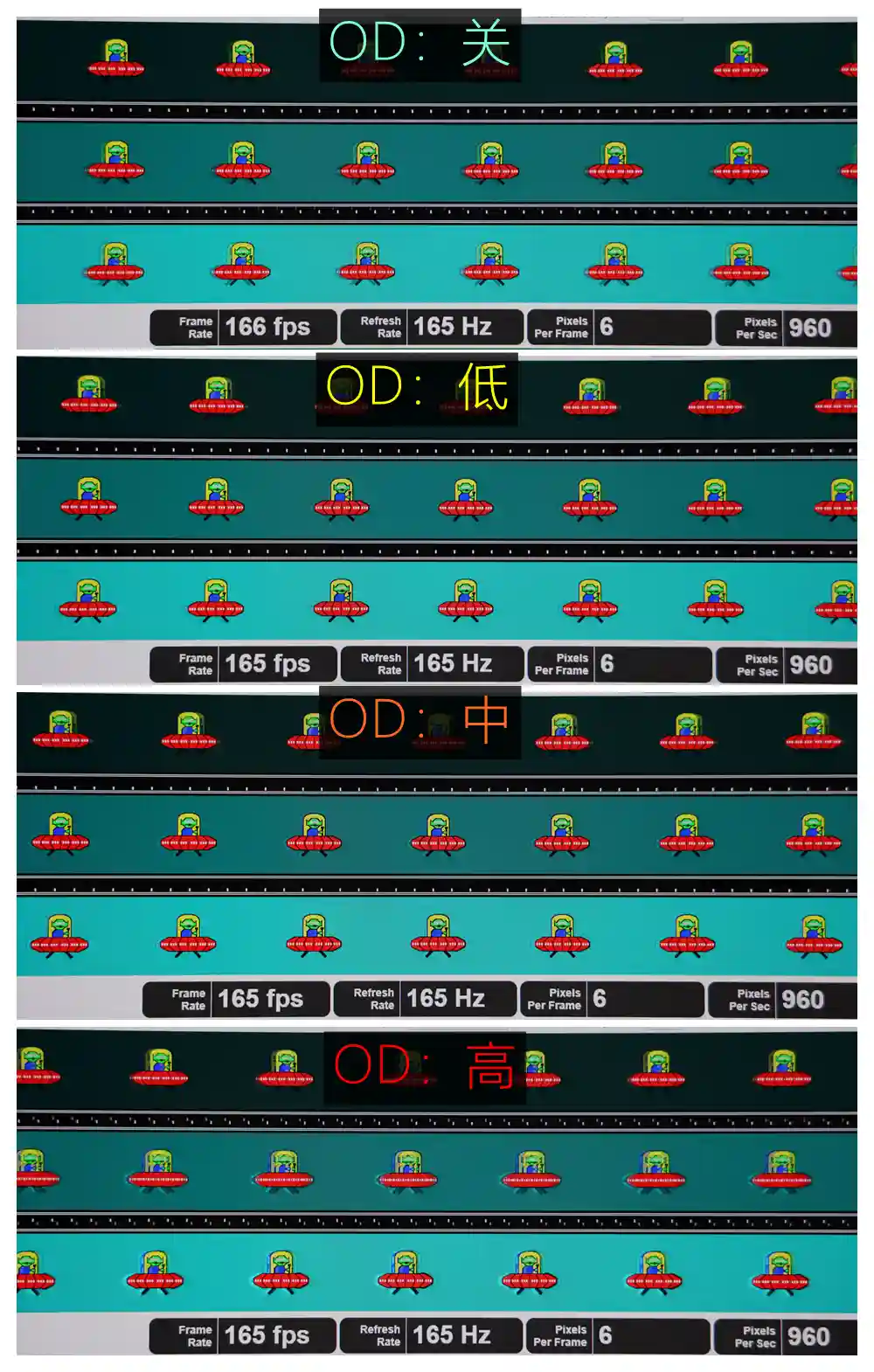 分析:K7E面板的原生GTG响应时间是5ms,丐武士的关闭档位大约是1层半拖影,此时的响应时间大约是4.5ms左右,当开启“低”档位后,拖影层迅速变淡,此时的响应时间大约在3.5-4ms左右,档位继续提升到“中”或“高”则开始出现鬼影或伪像,下半部分的UFO图像测试也印证了这一点,像素错率太高了,因此属于不可用的状态。因此丐武士的最佳使用档位为“低”,此时的响应时间跟黑武士如出一辙,此局可以认为两位武士打成平手。
