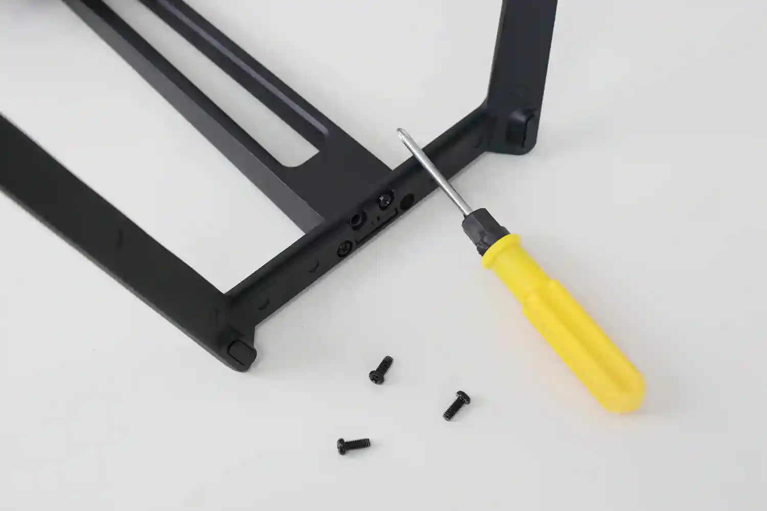 ▲丐武士的底座和支架连接需要用到祖传手艺——拧螺丝,需上紧4枚螺丝才算把底座固定好。这个支架和底座都是全铸铁材质,外面喷涂了一层漆,底部有四颗小小的防滑脚垫,手感沉甸甸又冰凉凉,质感一般。