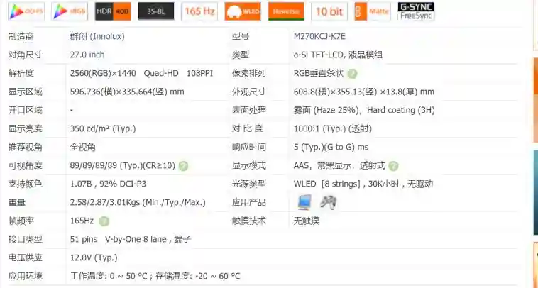 群创K7E面板的特性在上一篇黑武士的评测中已经介绍过了,这里就不再赘述了,就放一个参数图给大家看看。