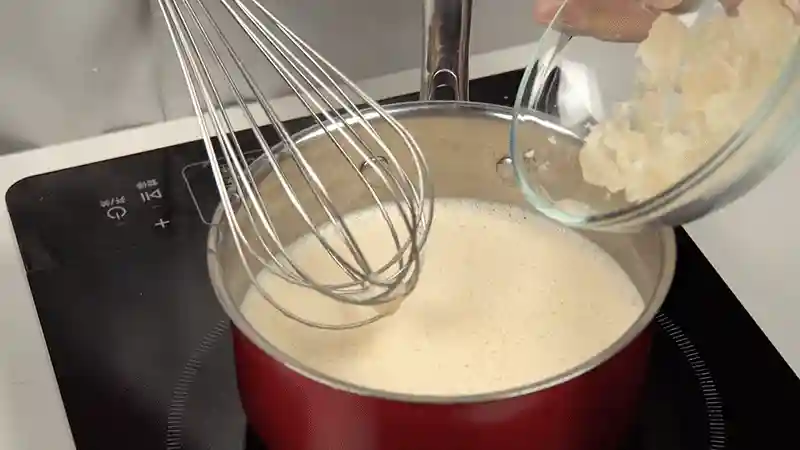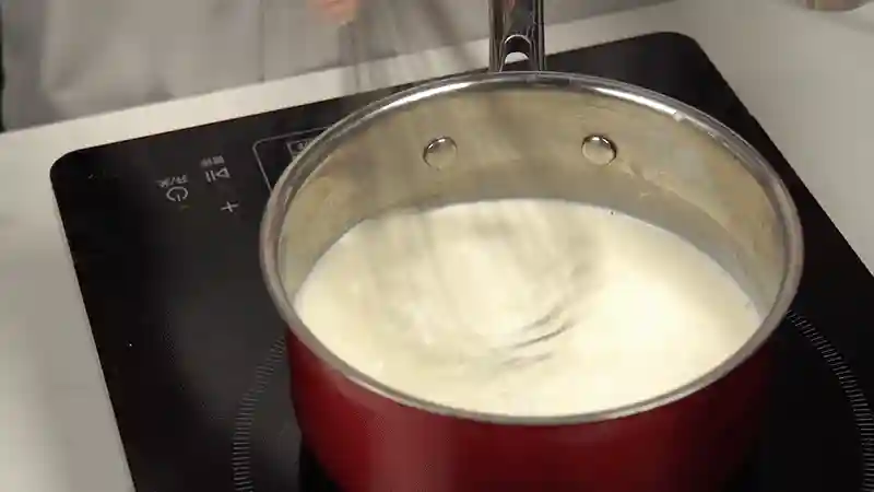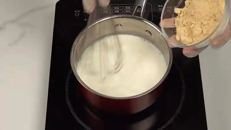 制作黄豆布丁:牛奶、淡奶油、砂糖混合,中火煮开;