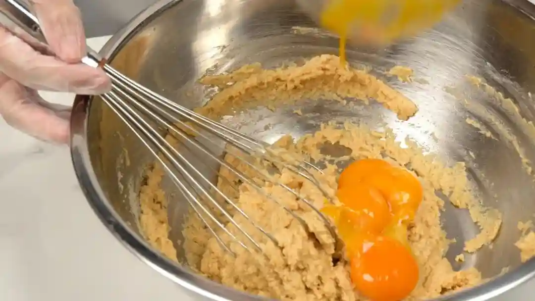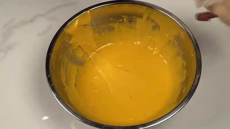 蛋白霜分次拌入蛋黄糊中,混合均匀至看不见蛋白霜的白色;