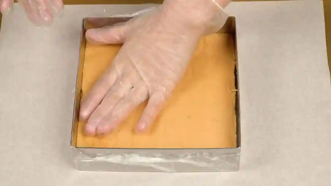组装:准备8寸慕斯框模具,铺一层约1.5cm厚的蛋糕胚,冷冻片刻;