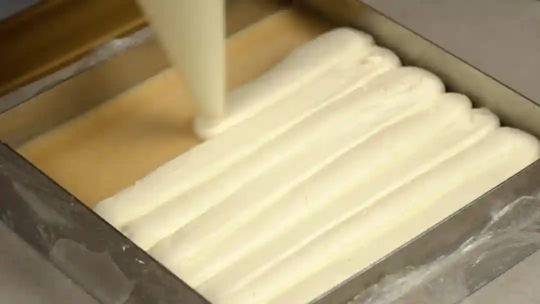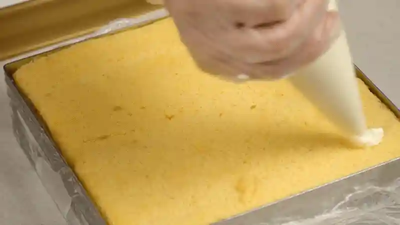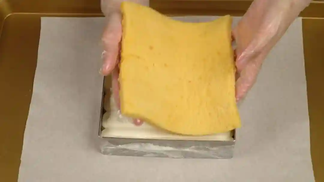 成型的黄豆布丁上挤一层马斯卡波奶油,抹平后再铺一层蛋糕胚;
