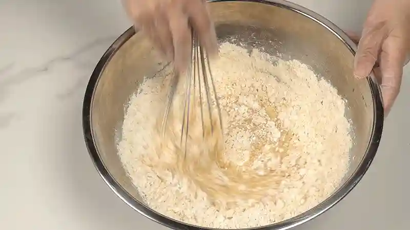 制作蛋糕胚:将水和色拉油混合,搅拌至乳化状态;