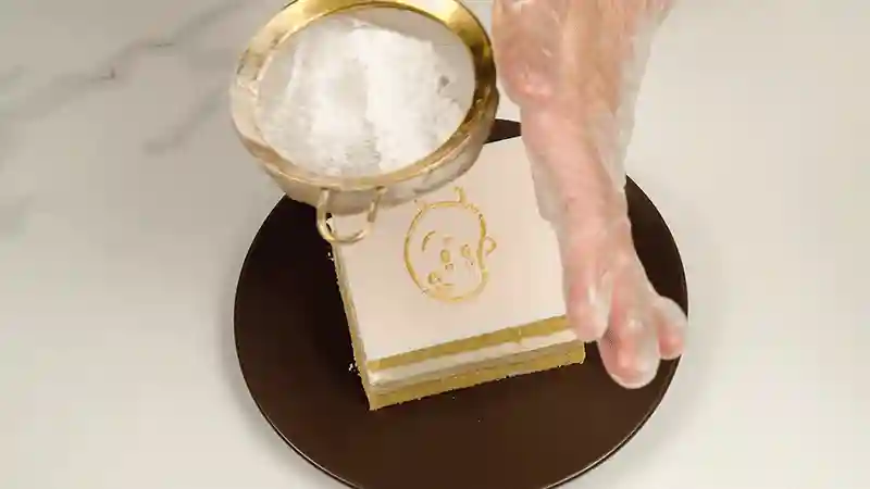 将蛋糕切分成所需大小,最后可用防潮糖粉筛出logo等图案,完成。
