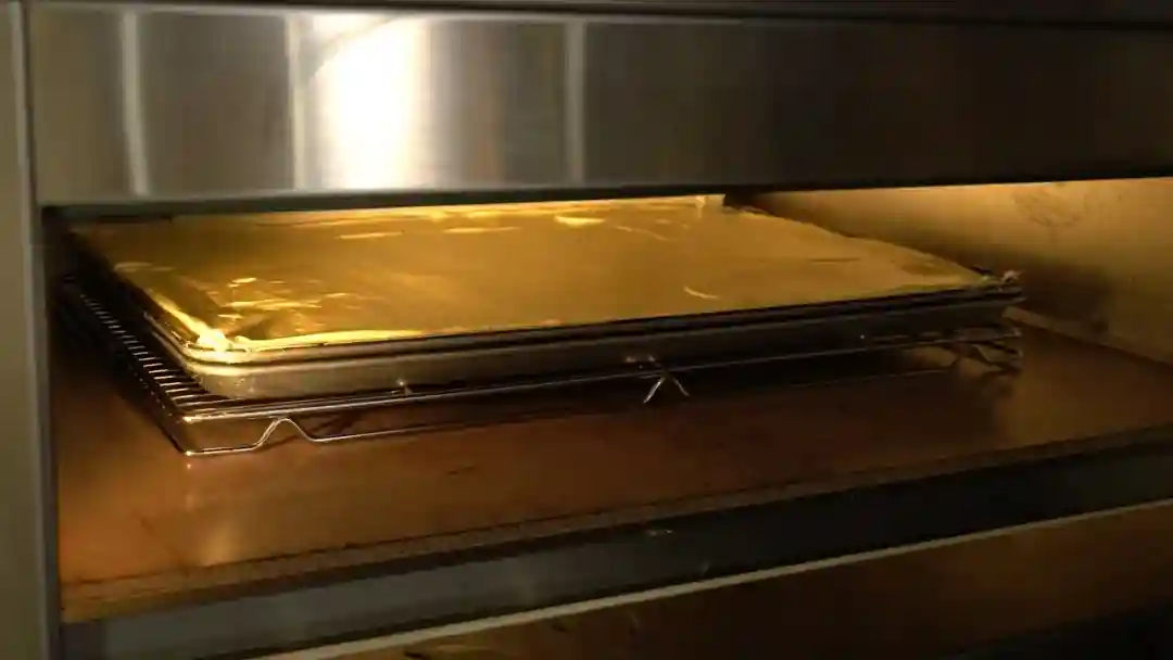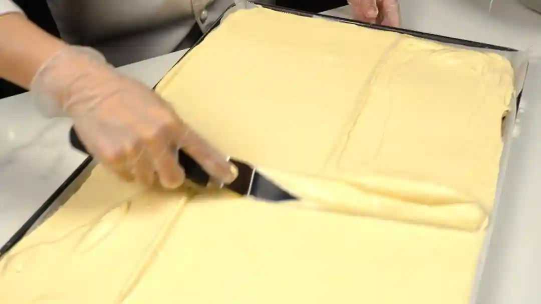 蛋糕糊刮扫入烤盘中,用刮板刮平,再震平消泡;