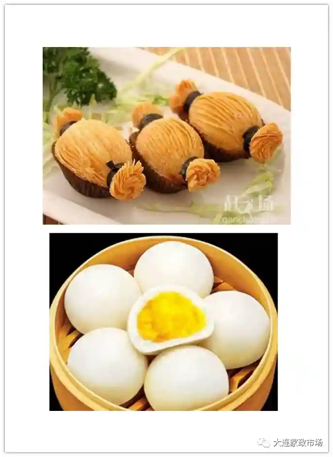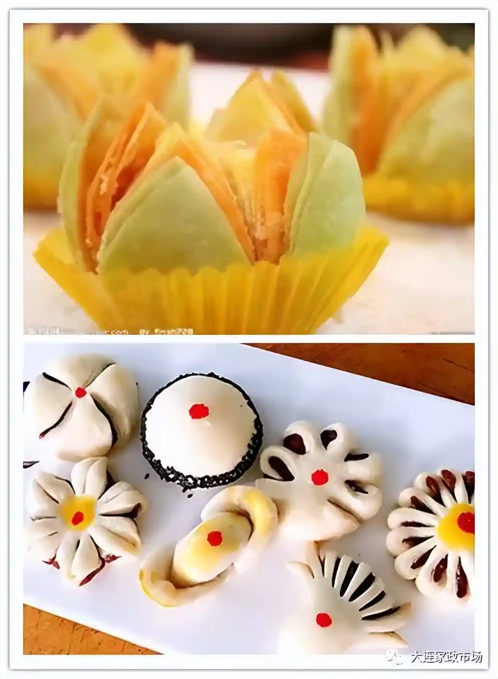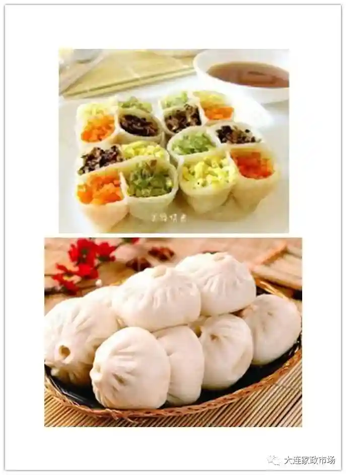 发面类:枣馒头、寿桃、鱼馒头、圆馒头、变形花卷(6种)、家常花卷、糖三角、水煎包、刀切馒头等。