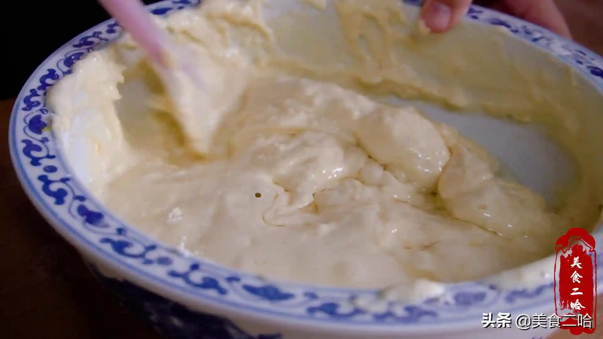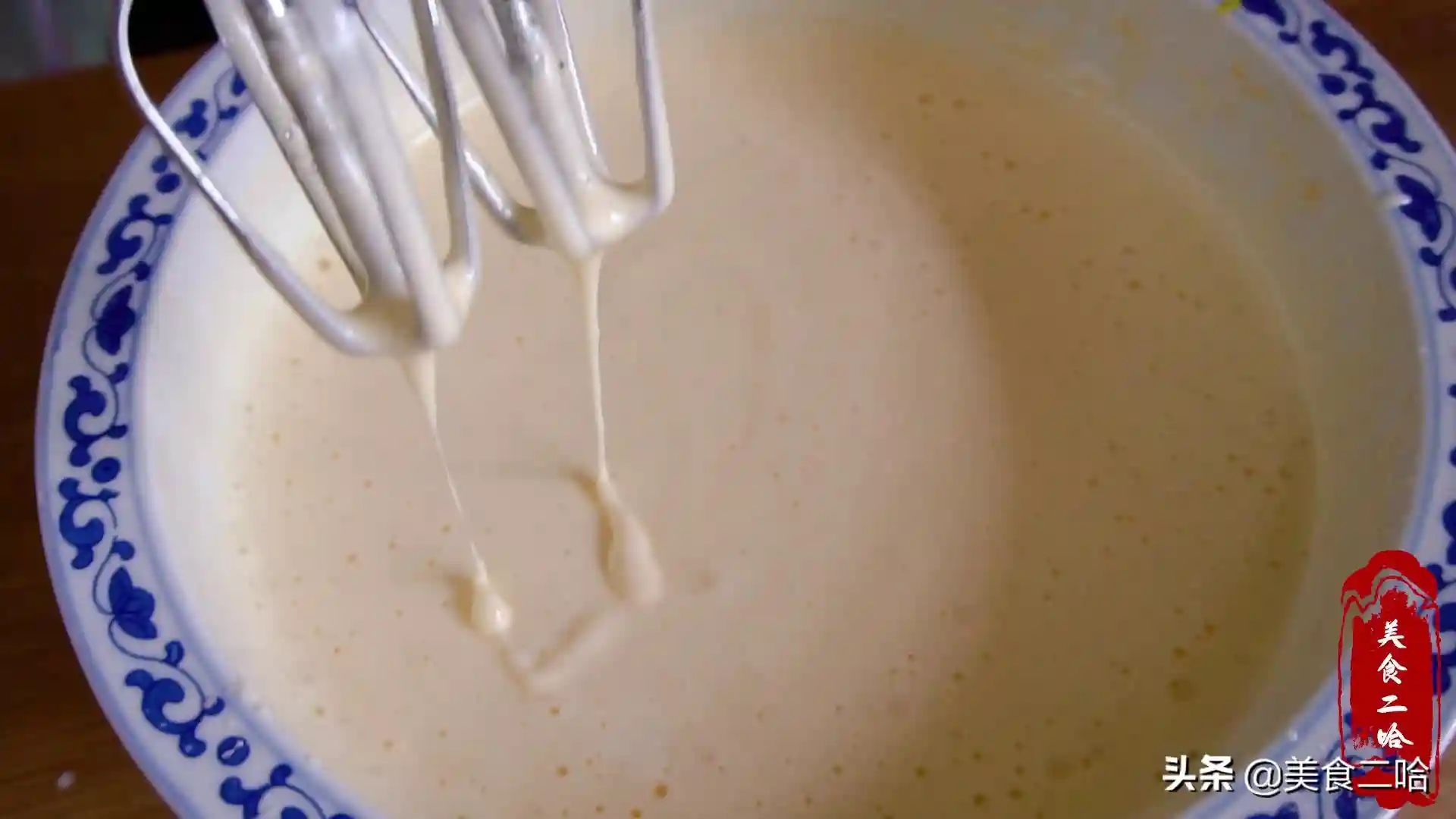 2、之后添加食盐,用打蛋器把蛋液打出粗泡,这时候加入50克白糖中的1部分,等打发到泡沫变小很细腻的时候再添加一部分白糖,最后打到很细腻出现纹路的时候加入最后一部分白糖,一直打到提起打蛋器画图案不容易消失的状态的状态是最好的。