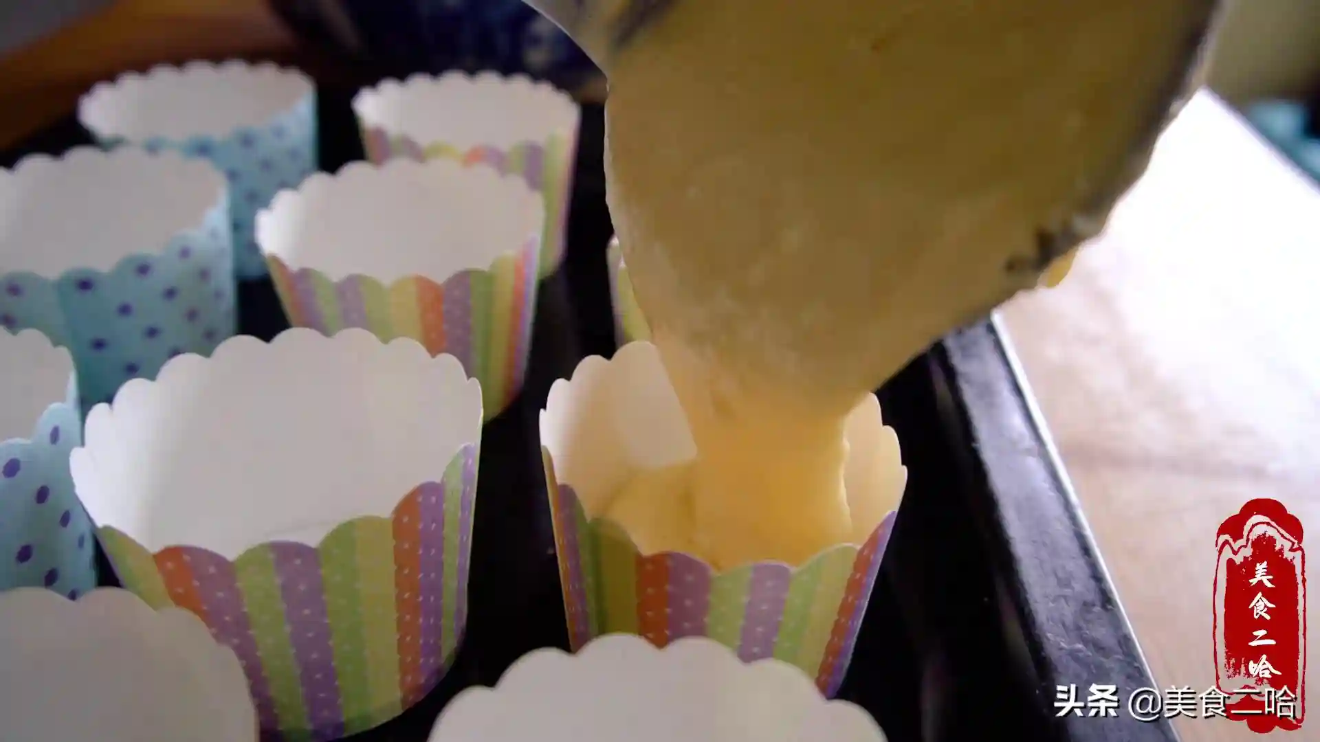 4、准备一些烤蛋糕的容器,把蛋糕糊倒进去,8分满即可,倒好之后稍微震动两下震出大气泡。