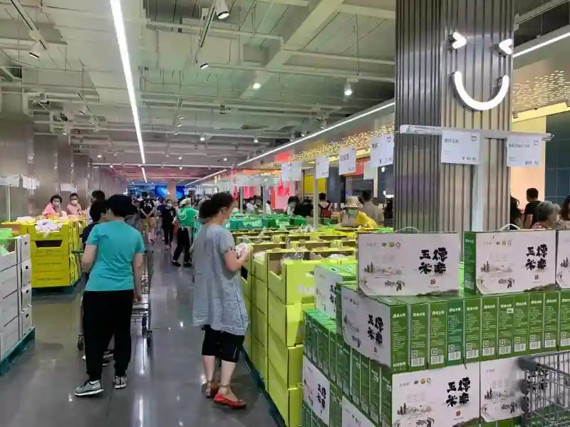 在人气最旺的水果区,每斤19.9元的榴莲、0.99元的山东西瓜、29.9元5斤的荔枝不断被顾客装进购物车,“杨梅、荔枝、榴莲,这些爆品都低于当天批发市场的价格,从早上七点开门到下午2点,每款都卖了几百箱。您看这西瓜快没有了,我正在申请仓库补货。”该店水果区负责人一边解答顾客的问题,一边忙着联系采购部门。