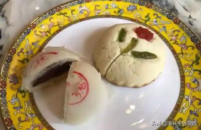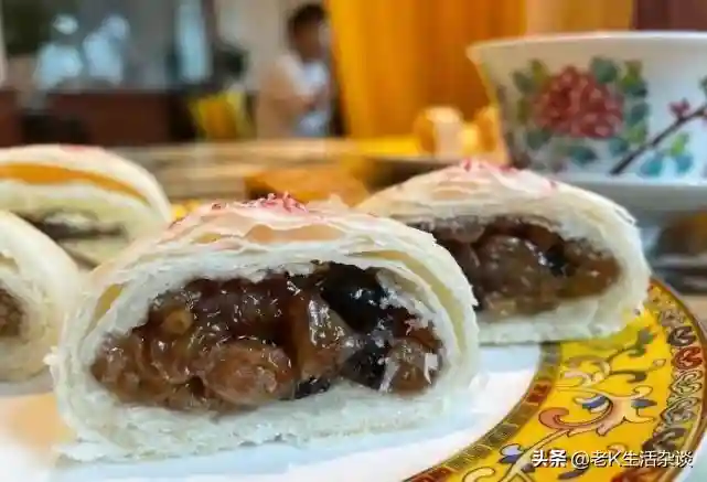 还有宫廷玫瑰饼,用的玫瑰都是每年5、6月采购来的鲜玫瑰腌制,用纯玫瑰丝当馅儿裹在薄如纸张的油酥皮里烤制而成。