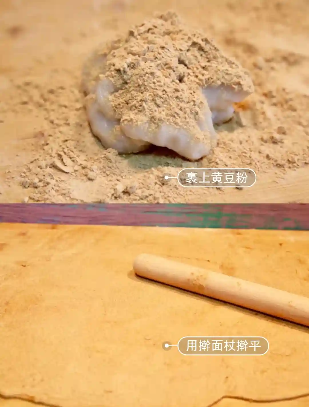 4.把黄豆粉过筛,铺在面板上,把面团用刮刀挖出来。用擀面杖擀成自己喜欢的薄厚大小。要经常撒黄豆粉,避免沾黏。