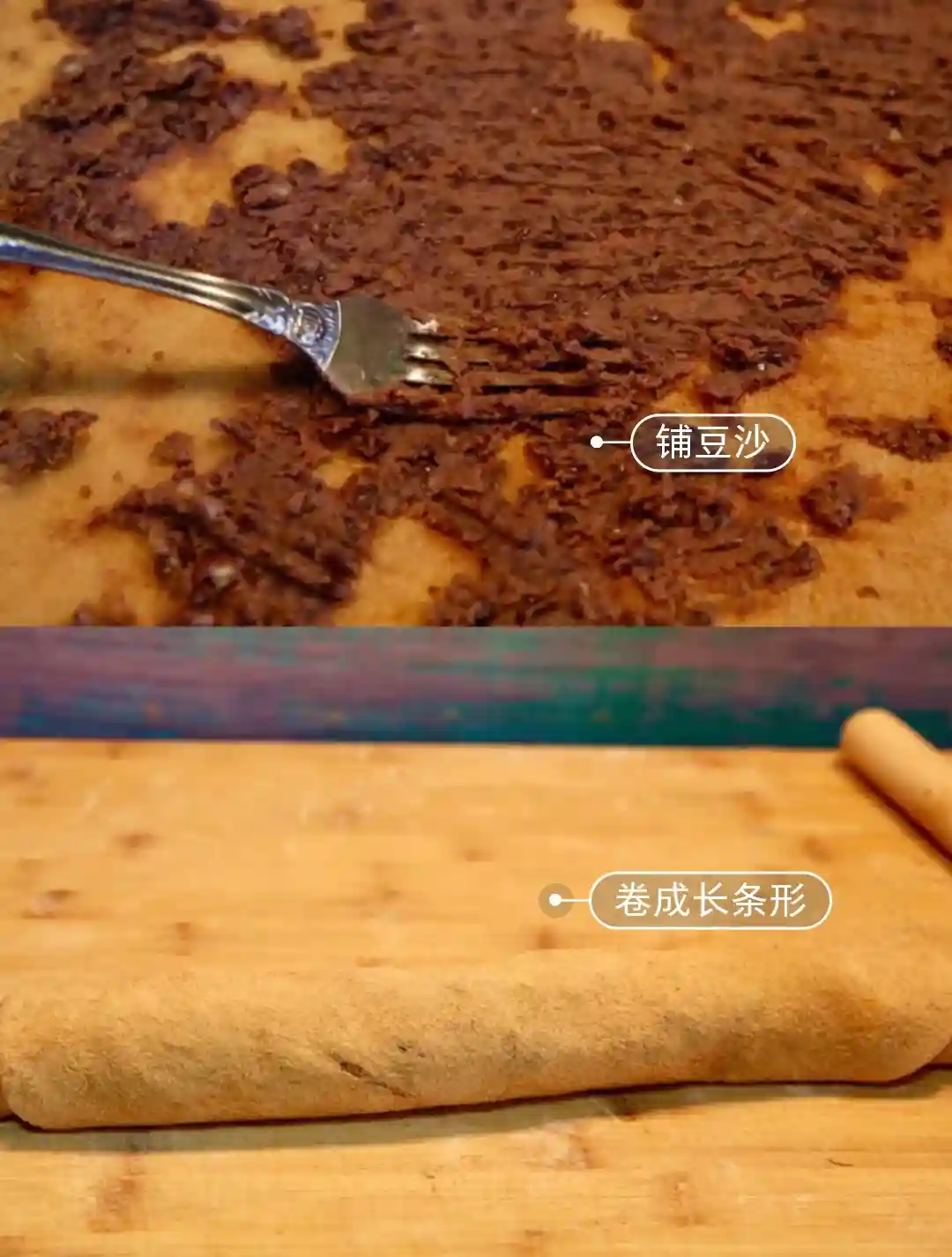 5.在糯米团.上铺满红豆馅,卷起,切开。