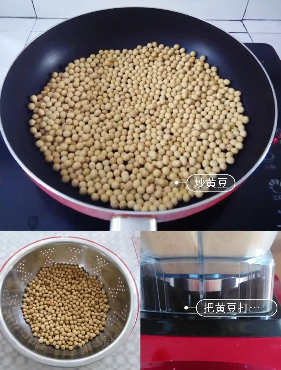1.无油无水的锅里放入100g黄豆,小火炒5分钟左右,把炒好的黄豆放在盆子里散热,放在破壁机里打成粉。