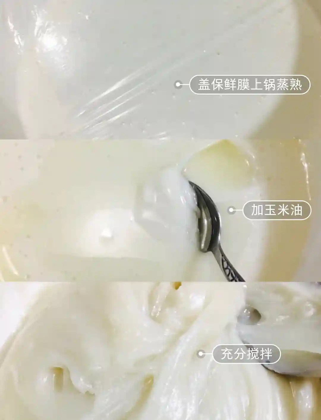 3.盖上保鲜膜蒸20分钟。蒸熟以后立即倒入玉米油,用刮刀均匀搅拌。