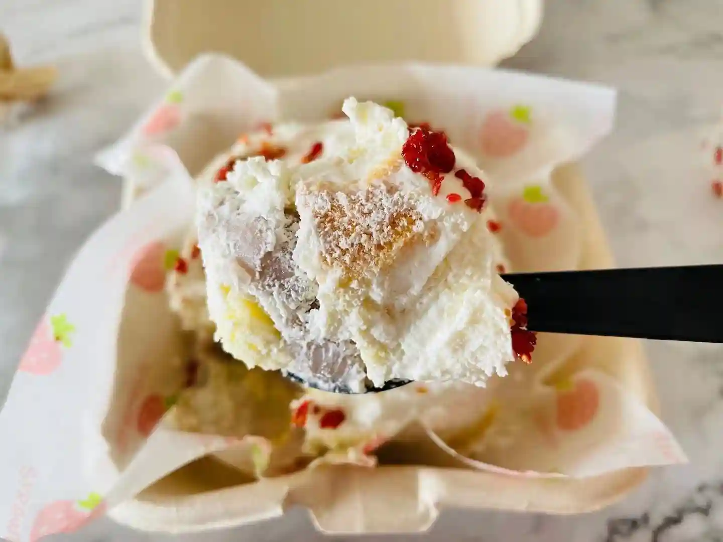 这个蛋糕就是好看的小熊盒子装着的,圆形的小蛋糕很美,草莓搭配松软的奶油看着特别有食欲,里面是一层奶油,一层蛋糕,一层芋泥这样叠加起来的,松软可口又丰富有层次,就是还是过于甜腻了。