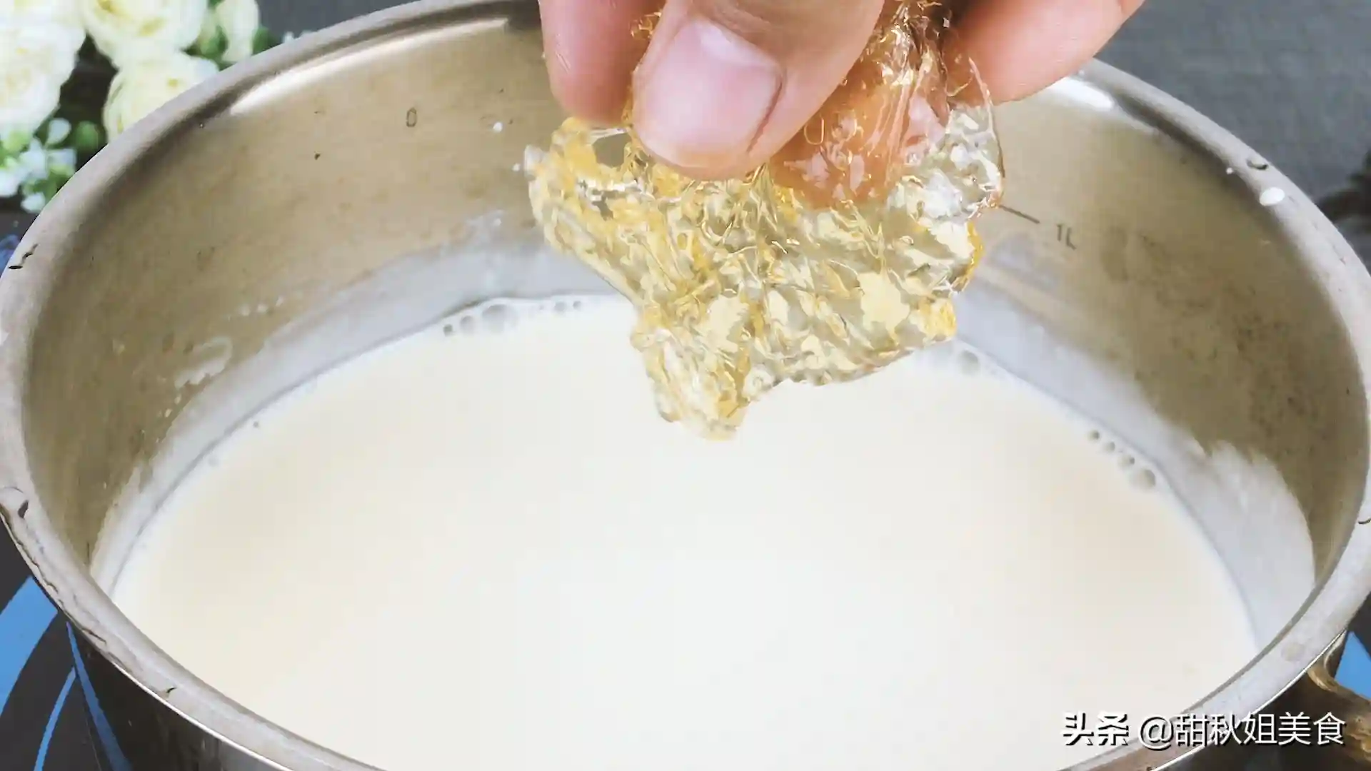 夏天,宁可不吃冰淇淋,也想尝一尝它,冰凉爽滑,解暑又解馋。首先我们在清水中放入一片吉利丁片,将其泡软备用。