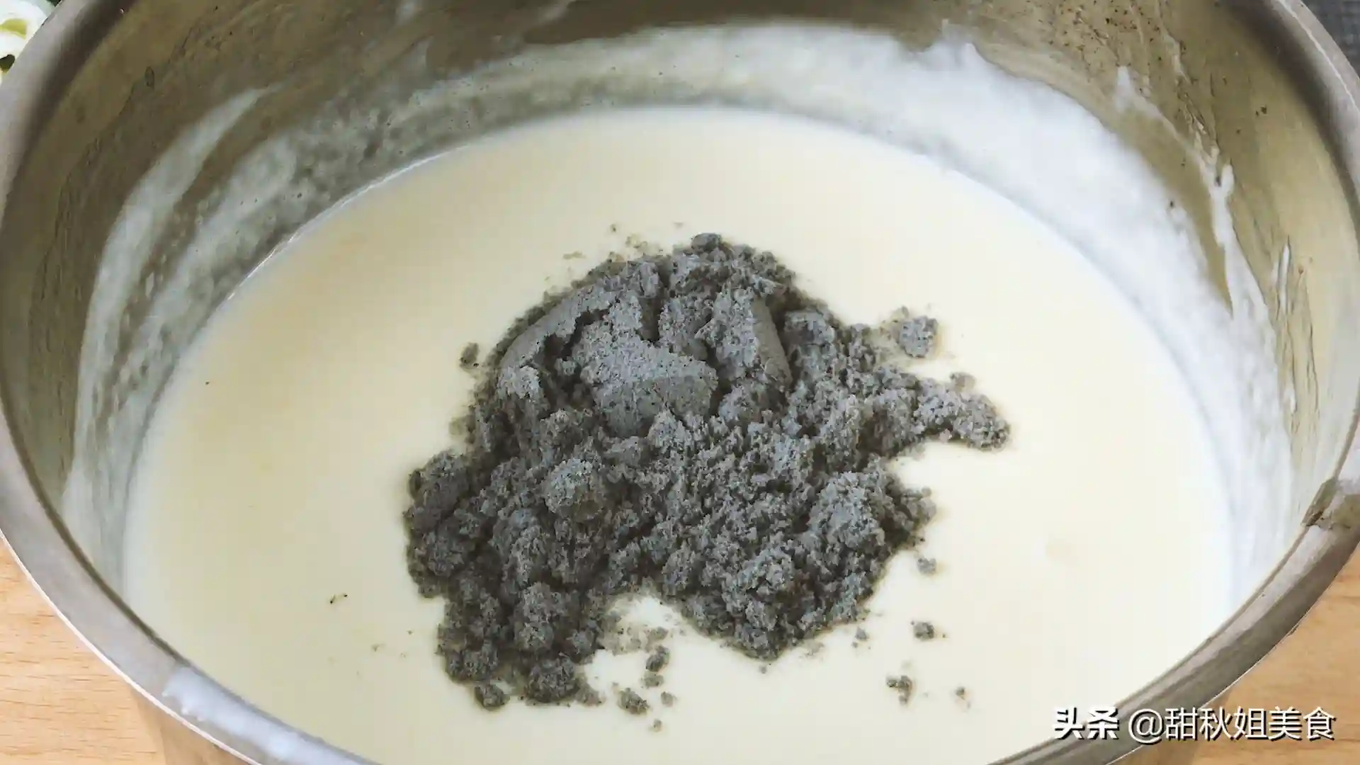 接着将奶油倒入模具中,放入冰箱冷藏凝固,马上我们还要做一个芝麻奶冻。