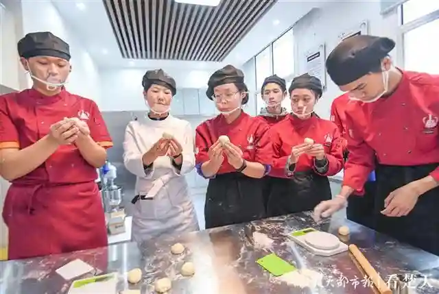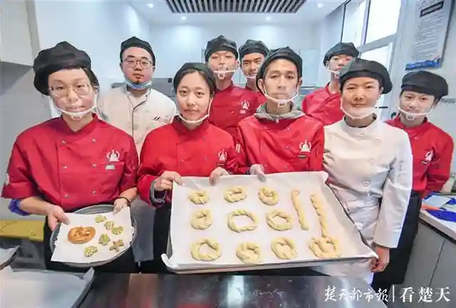 三年前,当学校提出开烘焙课,需要派老师去学习时,教历史的舒会容看到大家面露难色,就主动报了名。经过近半年的学习,舒会容穿上厨师袍回到学校,和专业师傅一起开起了课程。“说实在的,每天准备器材、揉面,比以前讲课累多了,但我不后悔。”舒会容笑着说,她了解到现在糕点师非常抢手,学这一行很容易找到一个收入不错的工作,能带着学生入门,让未来多一种可能,她感到很有意义。