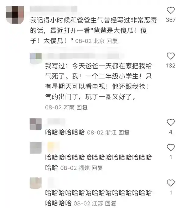 “我记得小时候和爸爸生气,曾经写过非常恶毒的话,最近打开一看,‘爸爸是大傻瓜!傻子!大傻瓜!’”