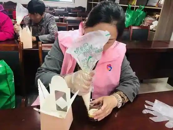 在烘焙老师和社工的耐心讲解和指导下,妇女姐妹们从打奶油、碎饼干、做花型等步骤一步步地了解木糠杯的制作流程,妇女们化身“西点大师”一展身手,大家不时地积极提问、互动交流,认真地参与制作的过程。