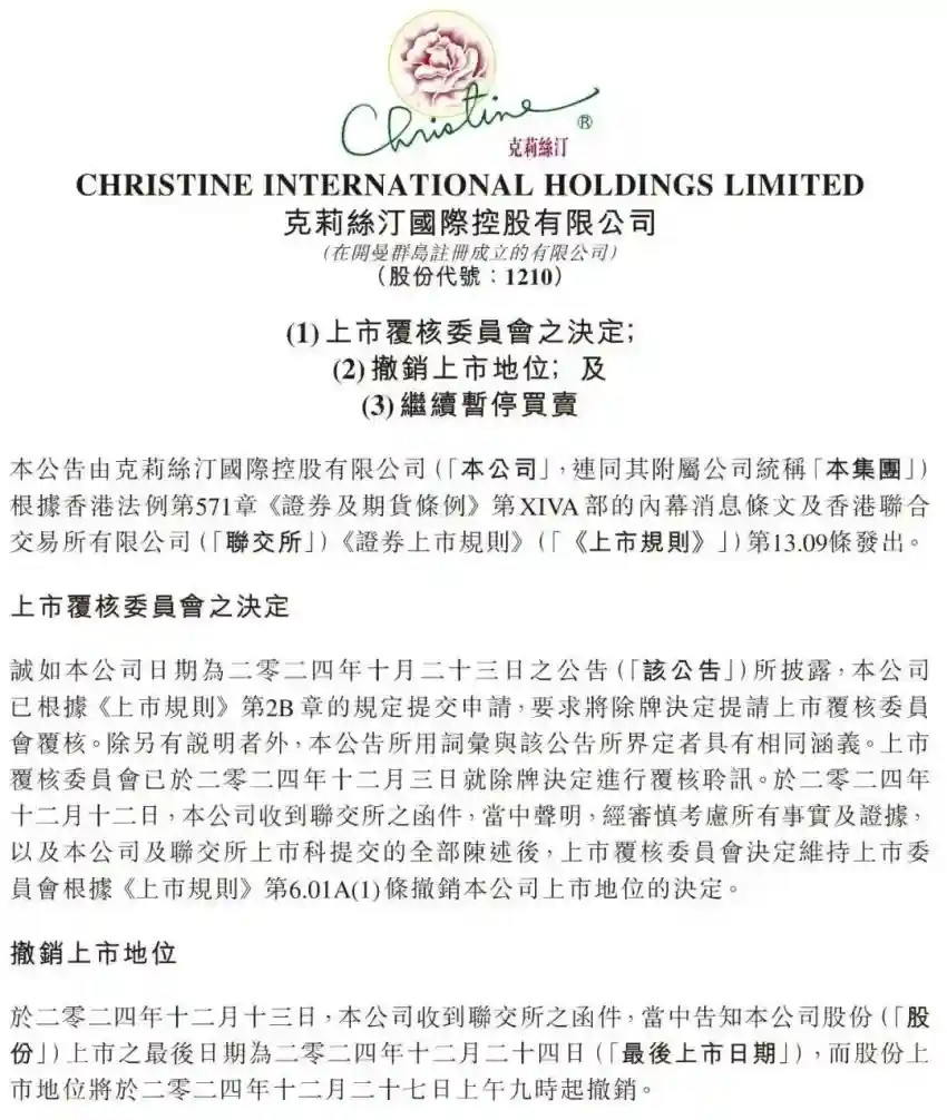 到了今年12月13日晚,克莉丝汀发布公告称,将在12月27日被撤销上市地位。