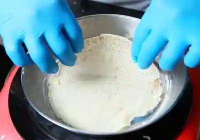 面糊较多者翻面可再煎3~5秒;前3、4张薄饼先用来「养锅(让锅子温度平均而稳定)」,呈色浅且容易破裂属正常现象,越到后面薄饼表面会呈现显著的焦糖色纹路,口感也越佳。