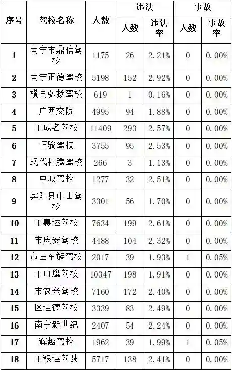 南宁车管定期向社会公布驾校考试合格率、学员取得驾驶证后三年内的交通违法率和交通肇事率等信息。