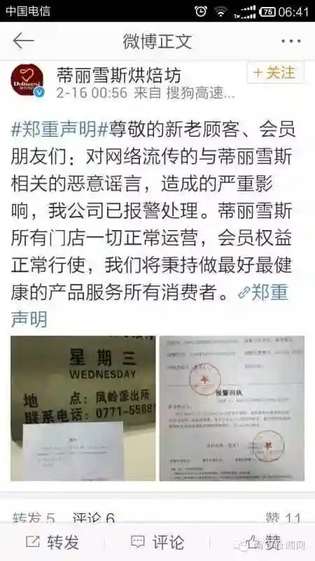 而且,蒂丽雪斯官方微信、微博也晒出了自己前往凤岭派出所进行报案的报警回执。小新从凤岭派出所处了解到,谣言一出的当晚,蒂丽雪斯就进行了报警处理,而且,凤岭派出所相关负责人表示回执的确是他们出具的,目前,警方正在调查核实当中。