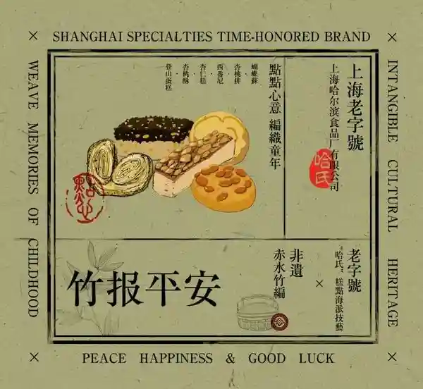 在今年5月,上海另一家老字号,哈尔滨食品厂与“赤水竹编”合作推出了“哈氏糕点‘竹报平安’礼盒。“哈尔滨食品厂”虽然以哈尔滨为名,却是名副其实的“老上海味道”,这家成立于1936年的食品店承载了几代上海人的回忆,还是接待美国总统尼克松的特色糕点,其糕点海派制作技艺也在2019年成为了上海市黄浦区非物质文化遗产保护项目。