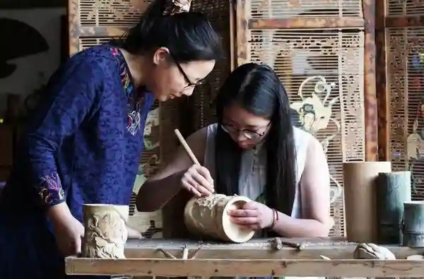 这一班中还有几位“赤水竹编”的学员,与“遵义藤编”类似,“赤水竹编”也以当地盛产的竹子为原材料,通过刮青、破竹、起篾、染色、煮蔑、拉丝等20多道工序,把一厘米宽的竹片被分成20根竹丝,经过精心编织成为竹编工艺品。