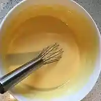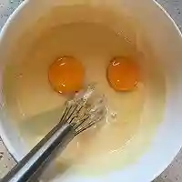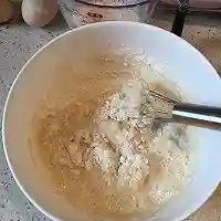 5.把鸡蛋打进牛奶与粉的混合物里。
