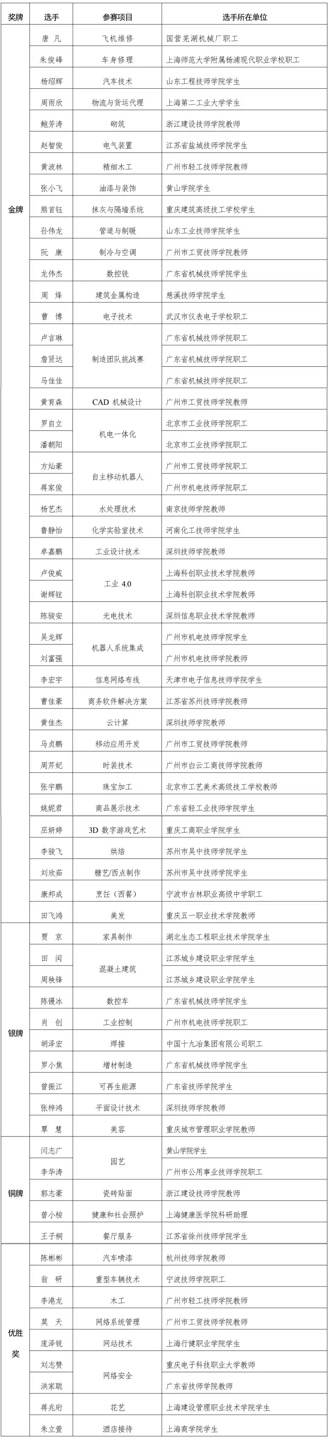 第47届世界技能大赛中国代表团奖牌榜