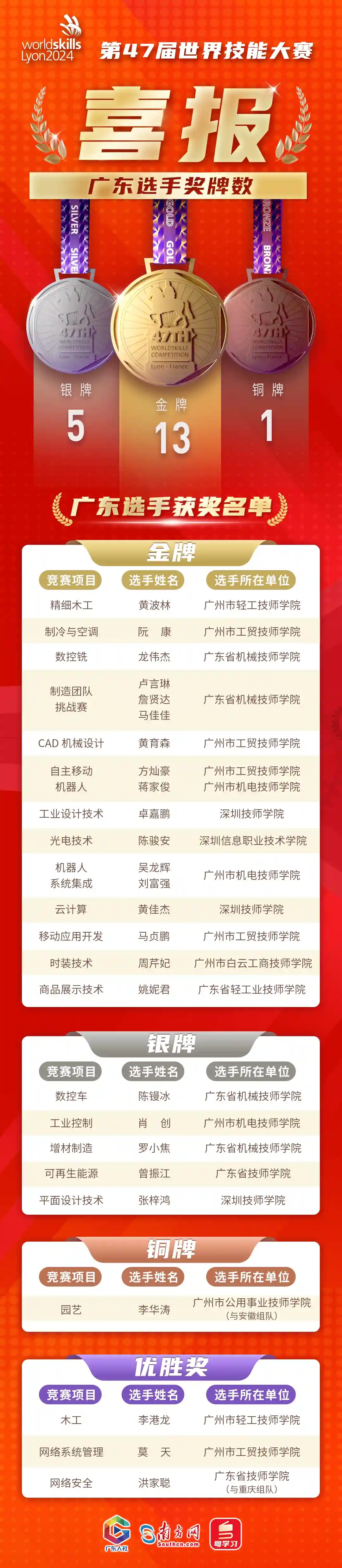 本次世赛,广东共派出27名选手参加23个项目比赛,总共获得13枚金牌、5枚银牌、1枚铜牌和3个优胜奖,金牌数量超全国金牌数的三分之一。广东世赛成绩也是广东高质量发展的标志,在7届世赛中,广东均有选手代表国家参赛,累计获得35金、16银、14铜和26个优胜奖。