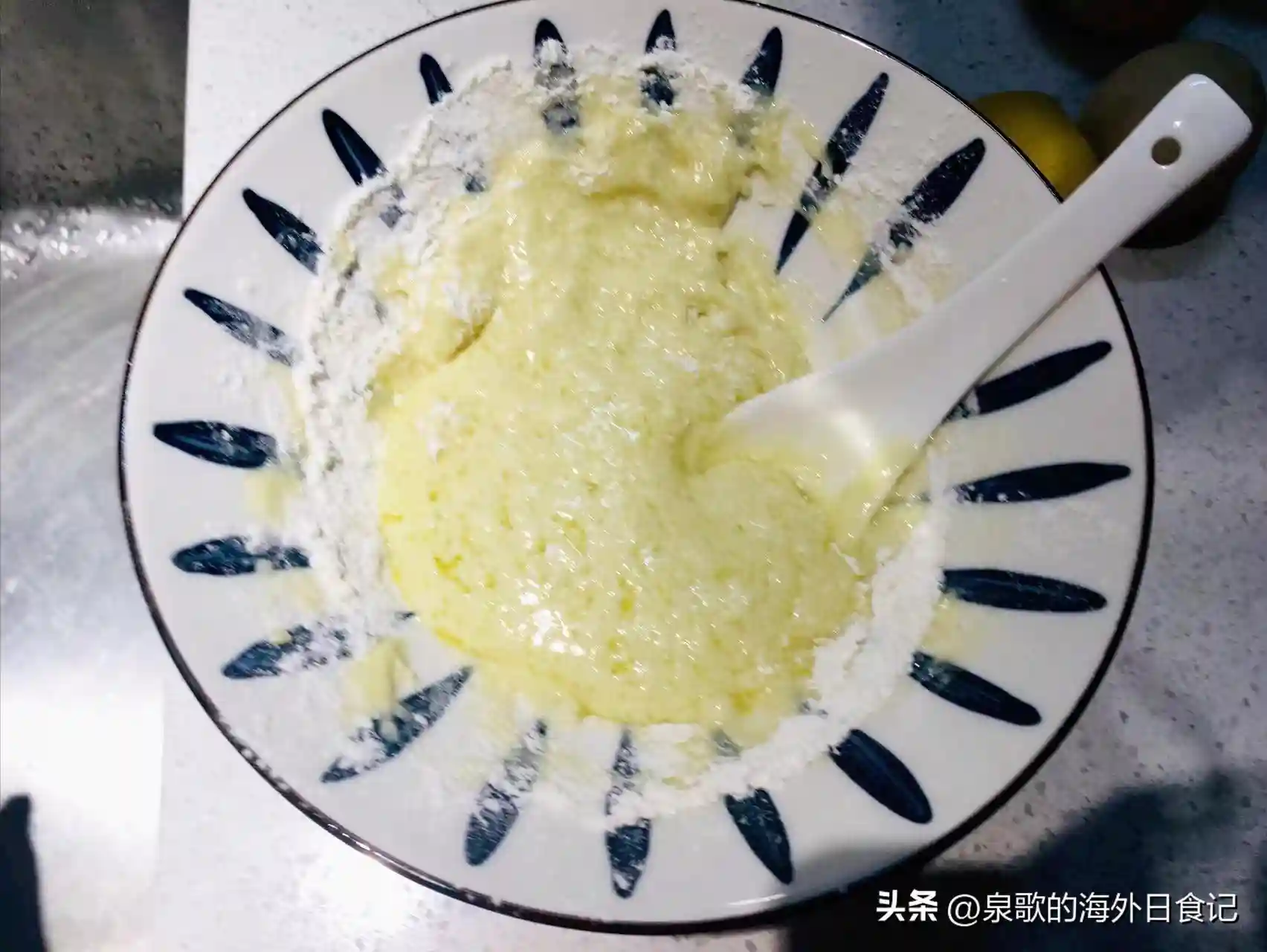 用刮刀取打好的1/3蛋白霜,加入到蛋黄糊中,搅拌均匀。这里的搅拌,可以用从下往上抄底翻拌的手法,也可以直接打圈搅拌[灵光一闪]要是怕这一步骤也会消泡,那就保险一点,抄底翻拌吧。