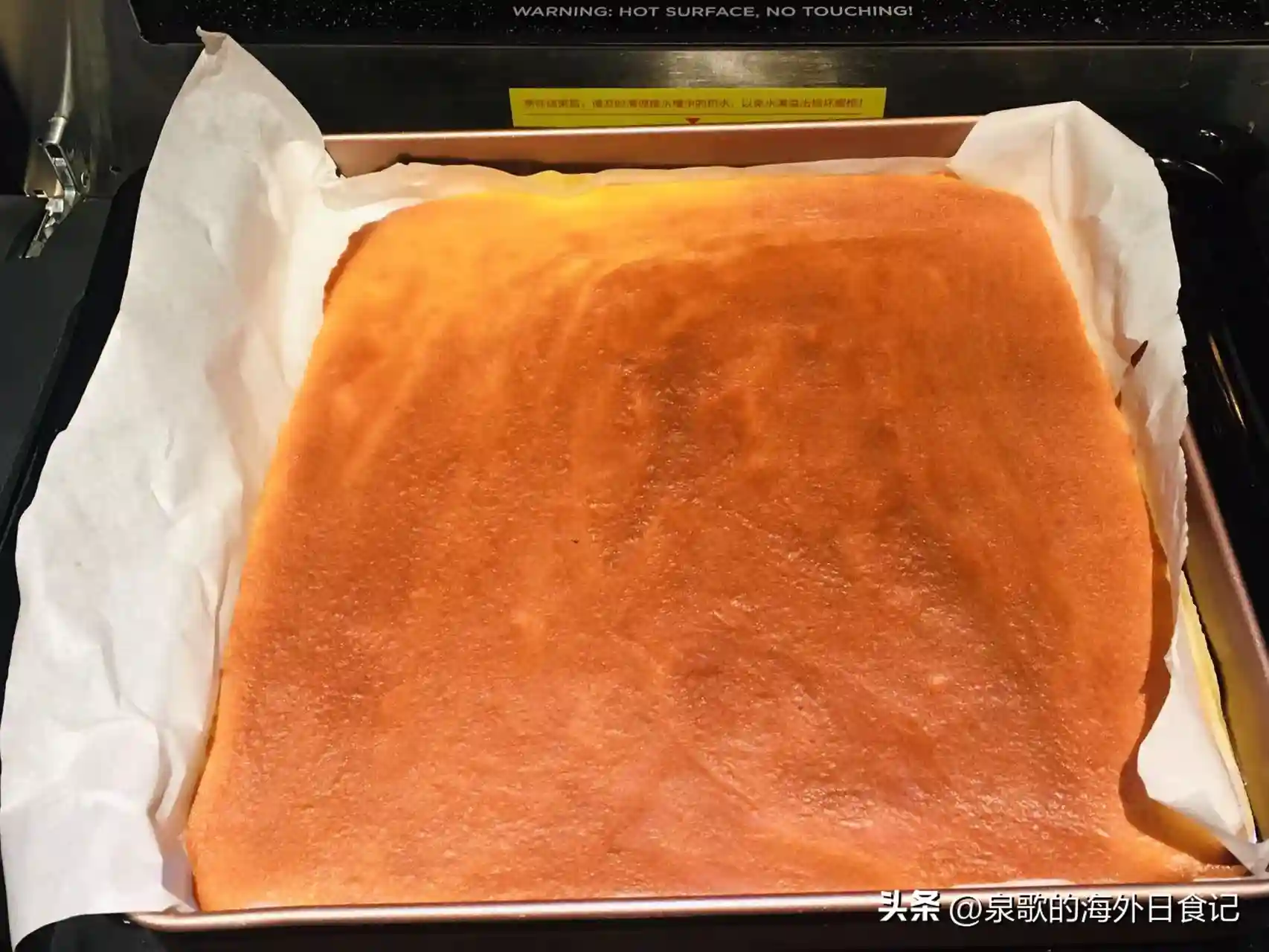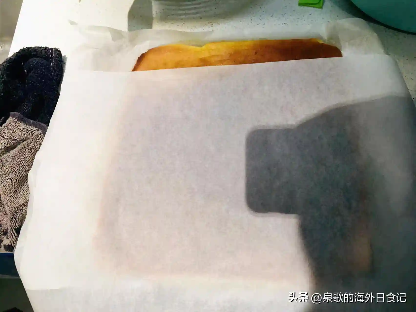 烤好的蛋糕胚连烤盘一起取出,放凉5-6分钟,用手在中间摸上去还有一些温热的时候,取来更大一张烘焙纸,盖在上面,翻个面:
