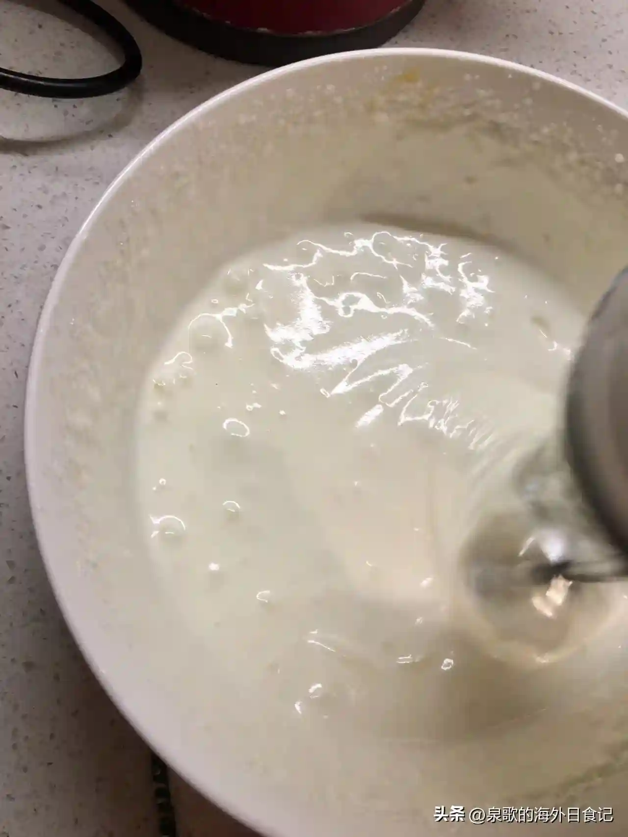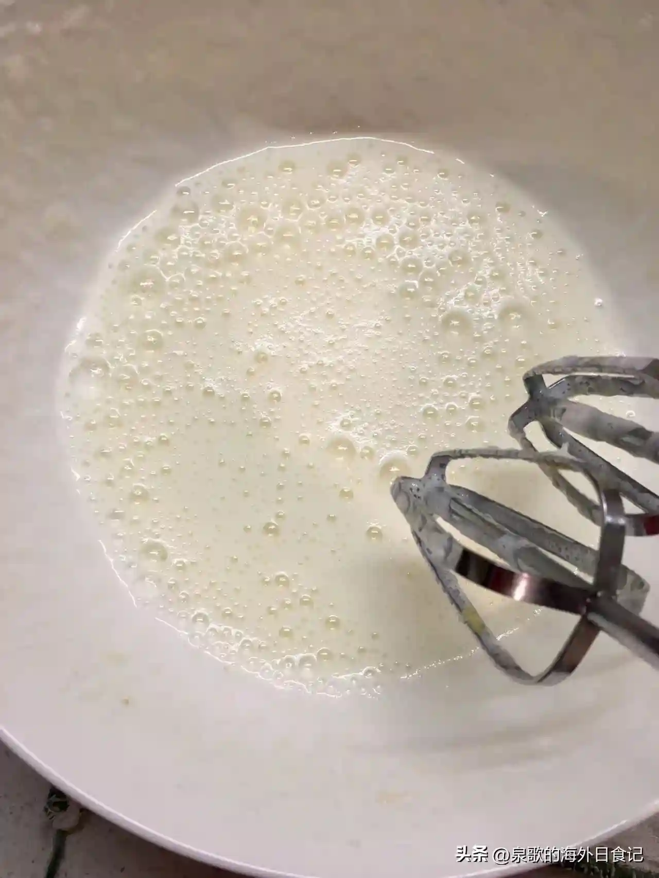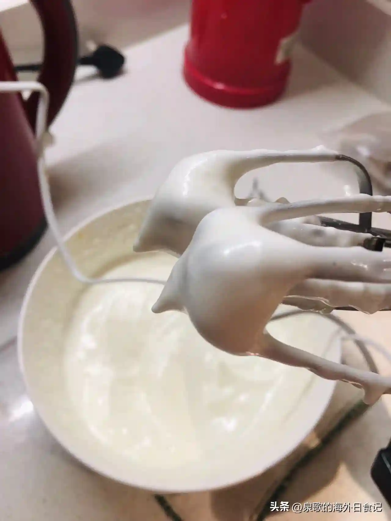 第三次是蛋白霜出现粘稠酸奶的质地,依稀可见打蛋器划过的纹路的时候。
