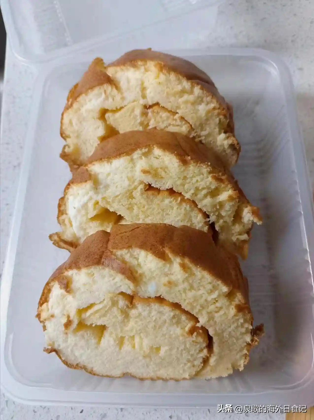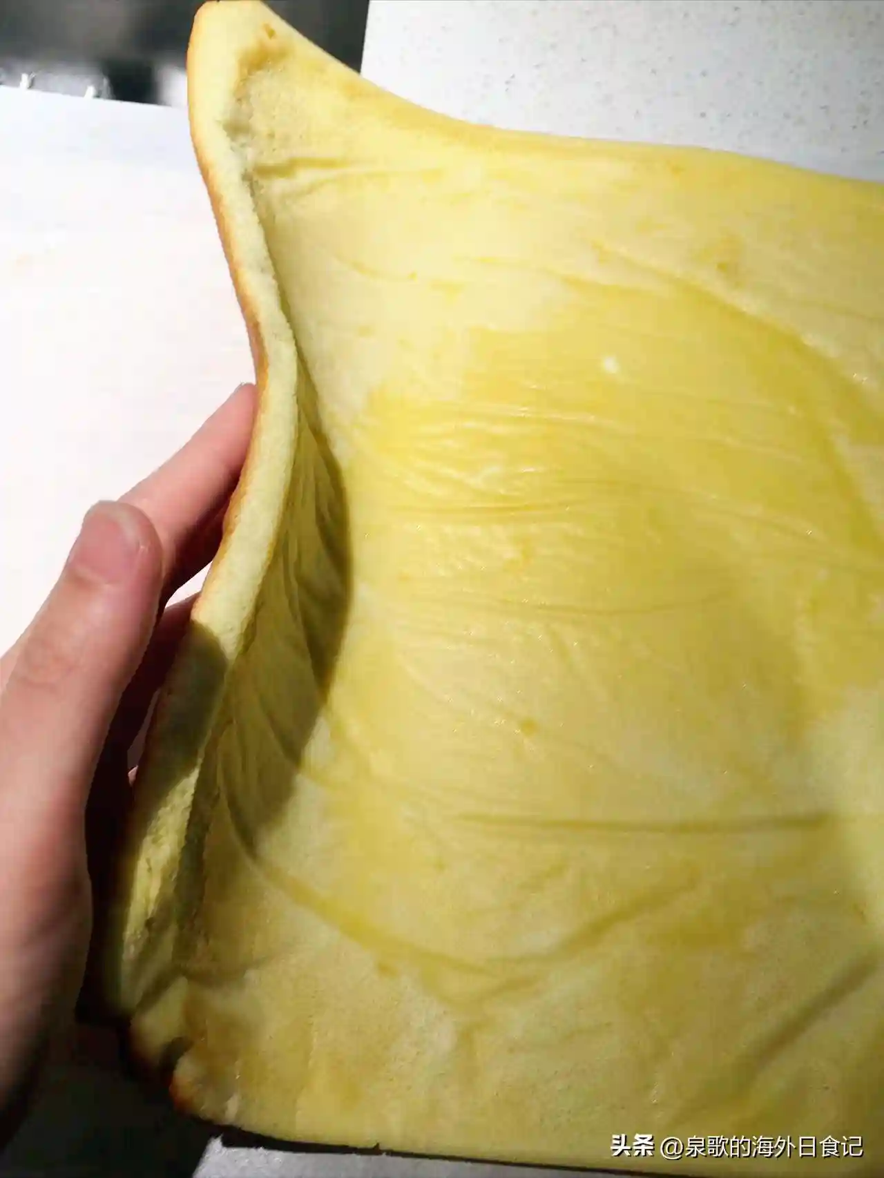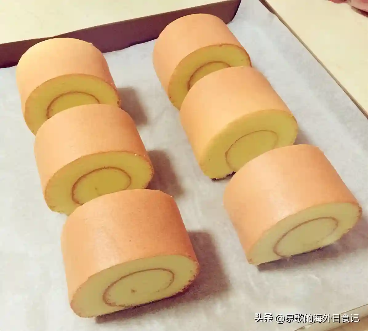 这是正常大小的原味蛋糕卷。鸡蛋和牛奶的量用得比较多,蛋白霜打发状态也是最佳的自然大弯钩状,所以蛋糕的厚度和蓬松度更好。6个左右的鸡蛋,能做10个左右正常大小的蛋糕卷: