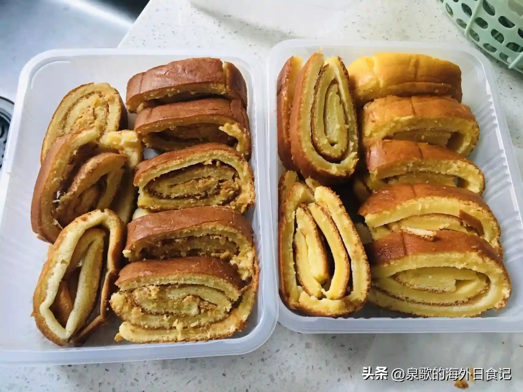 左边是肉松咸口的,后面是原味微甜的,咸口的蛋糕卷上色比较深。大家要想吃咸口的话,记得烘烤的时候看着点时间哦。