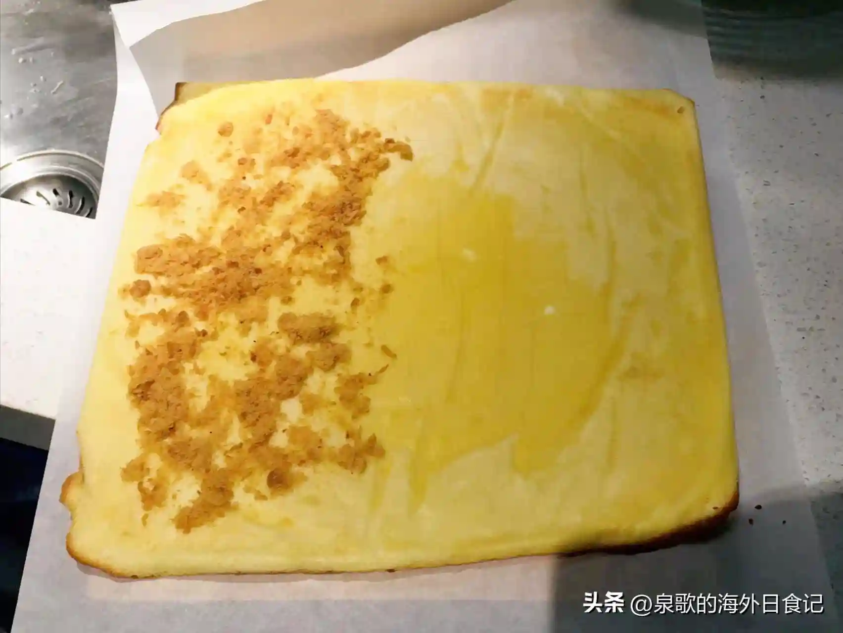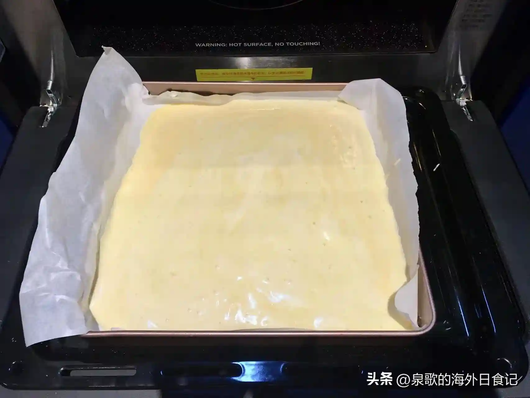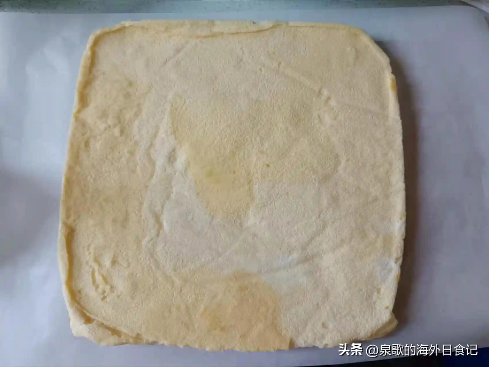 3.烘烤。预热烤箱至上下火175℃/347℉。烤盘上垫烘焙纸,纸裁得大一点,烤盘边缘也要包起来。这次用了28cm*28cm的方形烤盘,形状和深度都比较适合用来做蛋糕卷的蛋糕胚。