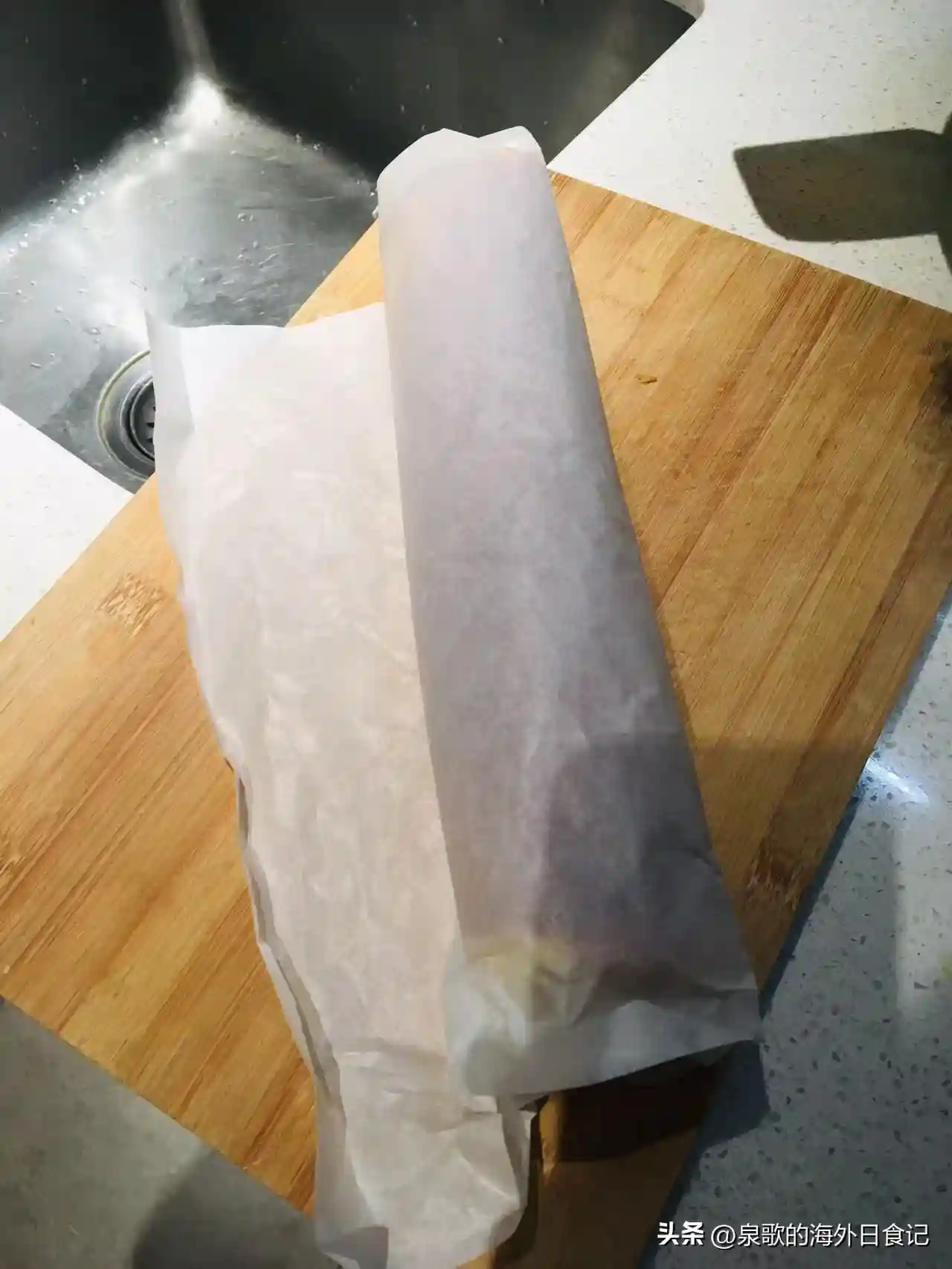 这个时候底部朝上,轻轻撕开烘焙纸,就可以开始最后一步——整形了。