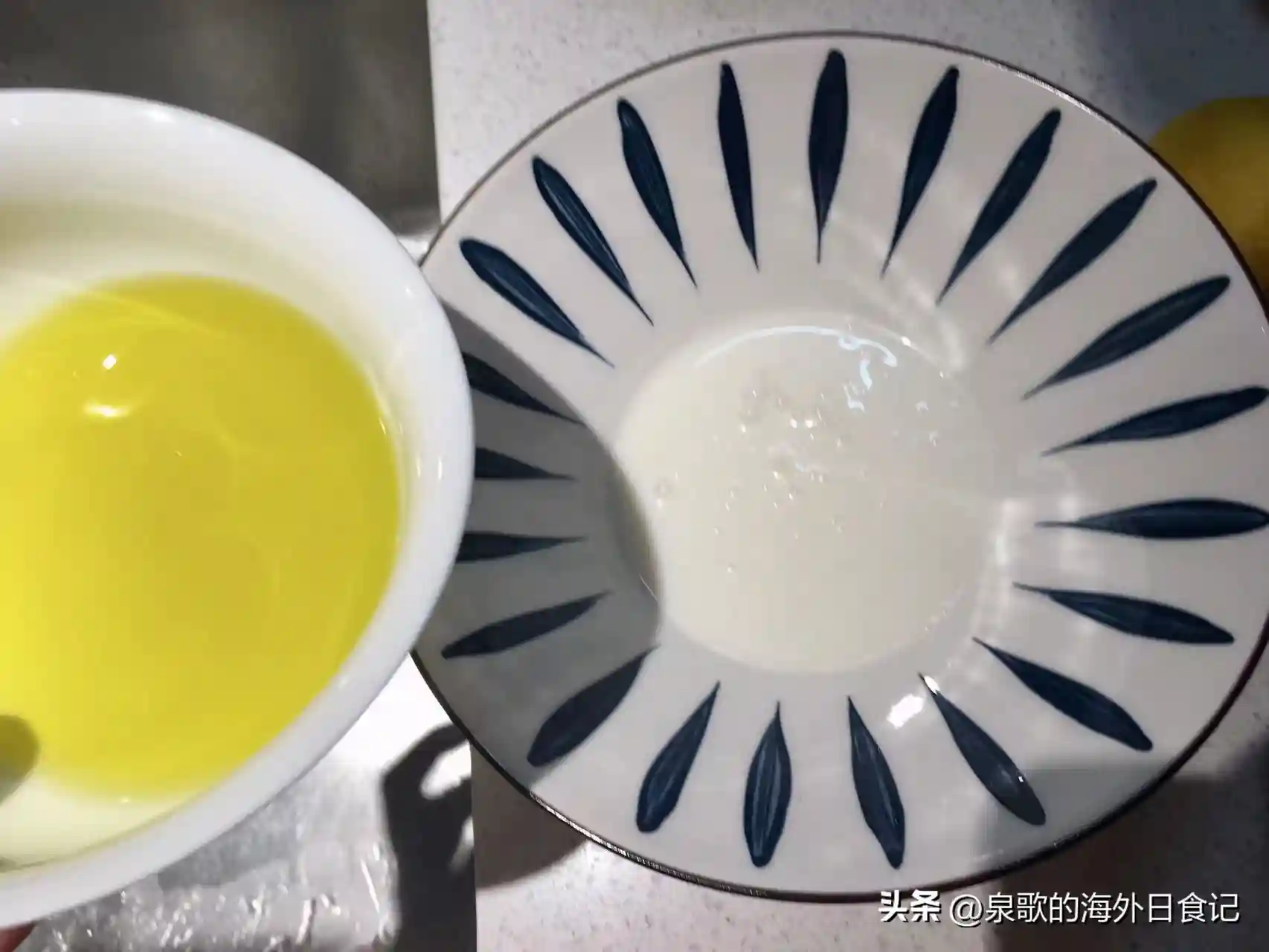 2.再做蛋白霜。往蛋清里挤入一些新鲜的柠檬汁(不是lemonade或者其他柠檬味的饮料哦[奸笑]加入柠檬汁只是为了帮助打发,所以不加也没事。