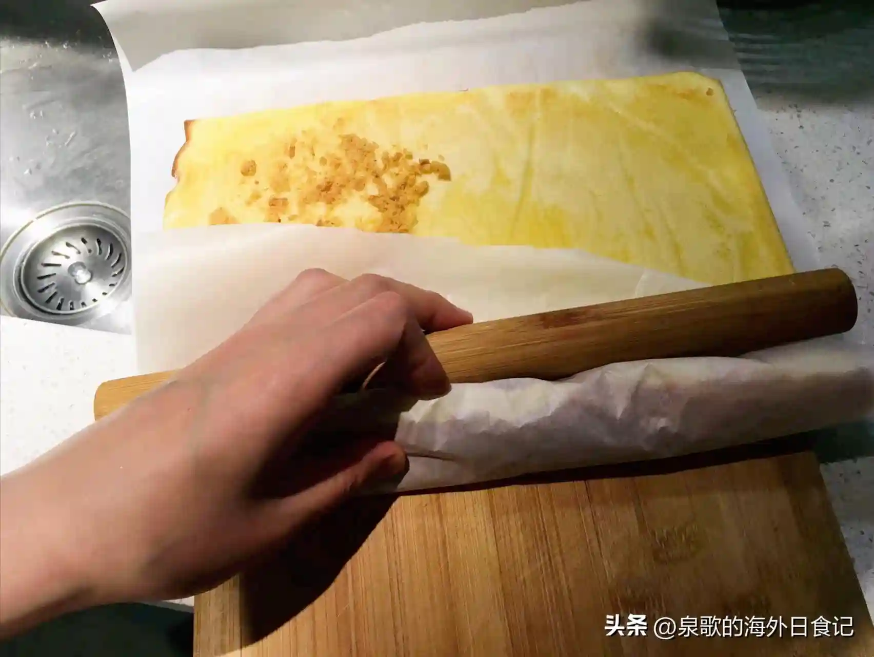 要是感觉卷得不够紧实,还可以拿一个刮板,一只手拉着下面烘焙纸的外边,刮板压住上面烘焙纸的外边,同时往蛋糕卷的方向戳。这样两个力一个往外一个往内,蛋糕卷就会进一步弄紧啦。